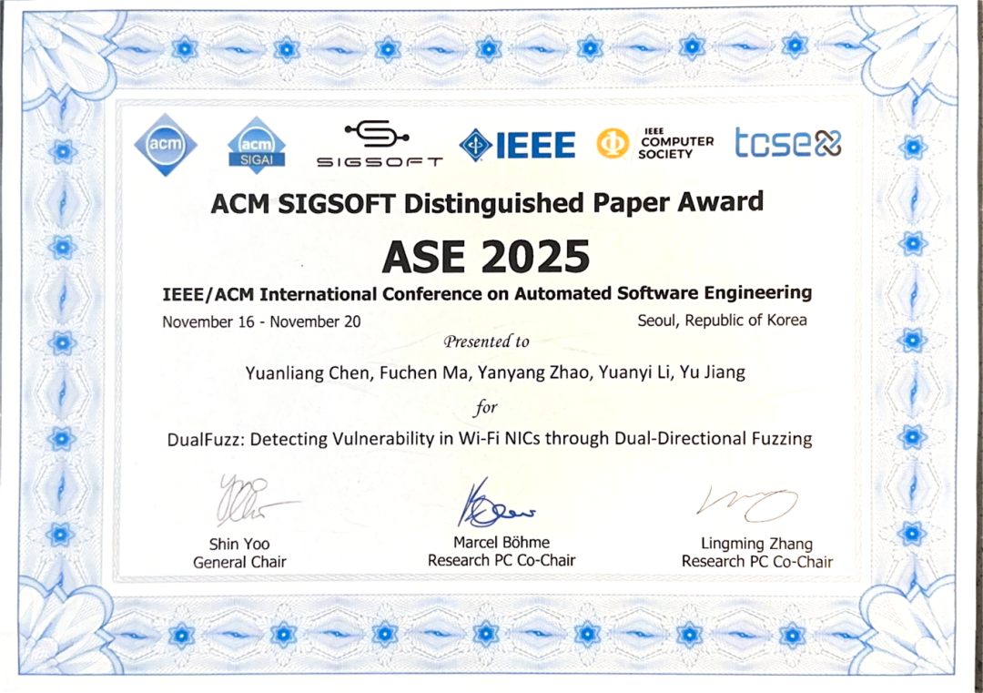 团队紧密开展产学研协同,突破WiFi、USB等目标安全测试效果瓶颈,多项成果发表于CCF–A类国际学术会议,并荣获ASE 2025最佳论文奖。